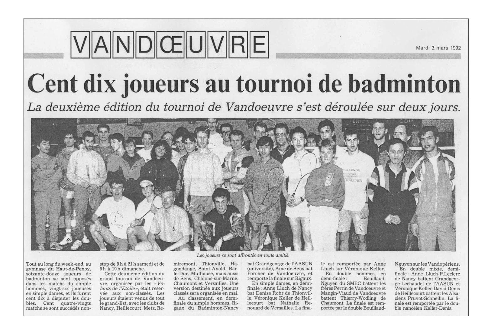 Peut être certains d'entre nous ne le savent pas, mais le Club de Badminton de Heillecourt (Grand Nancy) ne date pas de 5 ans ou 10 ans, mais beaucoup plus. Les extraits de presse ci-dessous en sont la preuve. Le club existe depuis 1987. D'ailleurs, c'est le plus ancien club du département Meurthe-et-Moselle. Vous avez ici des articles qui datent de 1990, c'est à dire de plus de 22 ans, l'âge de certains adhérents du club :)